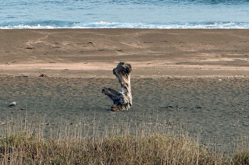 遠くからだと、しゃがんで頭の後ろで腕を組んでいるように見える流木。